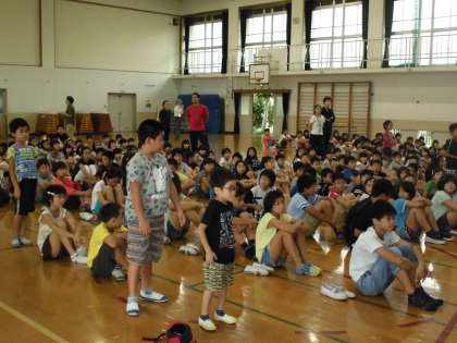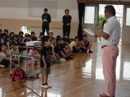 昨日の朝会で児童硬筆書写作品展入選者の表彰式がありました。