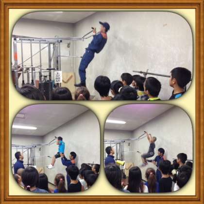 消防士さんのトレーニングの様子を見せていただきました。今回は,けん垂をしてもらいました。簡単そうに見えますが,大変ハードなトレーニングです。子どもたちもさせてもらいましたが,一回も出来ませんでした。