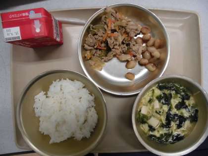 今日の給食の献立は,「ご飯」「かきたま汁」「豚肉とゴーヤの生姜炒め」「とらまめの甘煮」「牛乳」です。