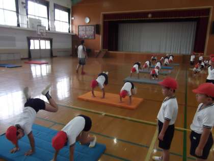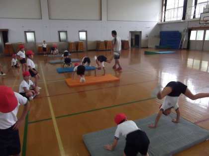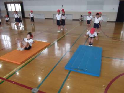 体育の時間に「マット運動」を学習しています。前回に引き続き前転,後転の練習をしていました。ずいぶん前転,後転が上手になっていました。