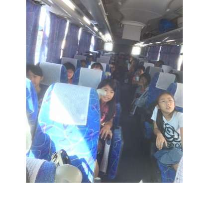 ダイハツ池田工場に向けて出発しました。移動のバスの中で,トイストーリーを見ています。みんなビデオに釘付けです。