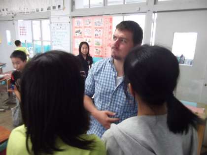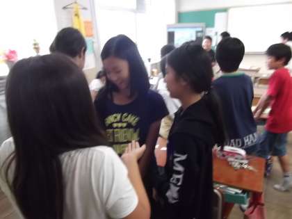 今日の外国語は,挨拶の仕方を教えて頂きました。写真は,みんなで挨拶の練習をしていまいす。