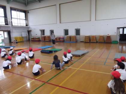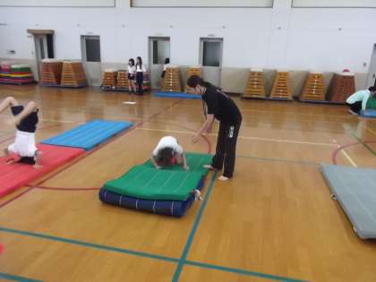 体育の時間に「マット運動」を学習しています。今日は,前転・後転の練習をしていました。