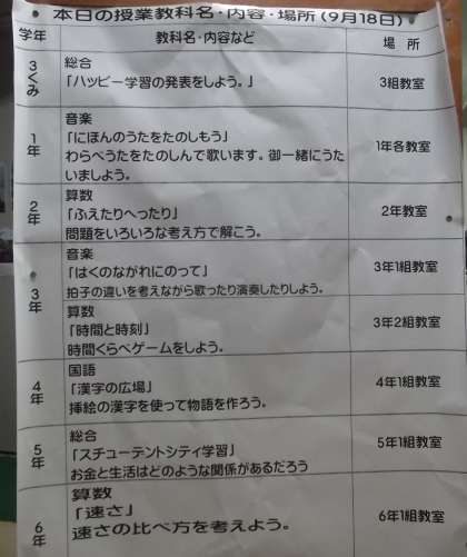 明日は,授業参観・懇談会があります。長寿化工事に伴ない授業参観の会場を次のように変更します。なお,授業参観の受付は,体育館横で行っていますので,南門(アルプラザ側)から来校してください。よろしくお願いします。3くみ(1F)・2年生(2F)は,北校舎の各教室で行います。1年生(2F)・3年生(3F)・4年生(3F)・5年生(3F)・6年生(3F)は,南校舎(運動場側)の各教室で行います。