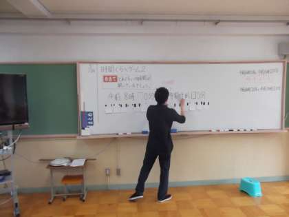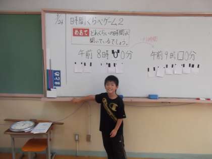 算数の時間に「時間と長さ」を学習しています。今日は,時刻と時間をもとに,時刻を求めていました。