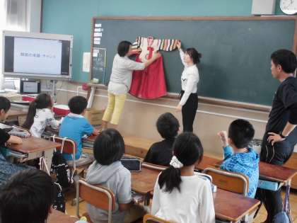 今日は,多文化授業で「オ ヨンジュ先生」から韓国の文化について教えていただきました。お隣の国ということで,挨拶や民族衣装など,どこかで見聞きしたものもありました。韓国の民族楽器チャンゴの演奏には,みんなが盛り上がりました。