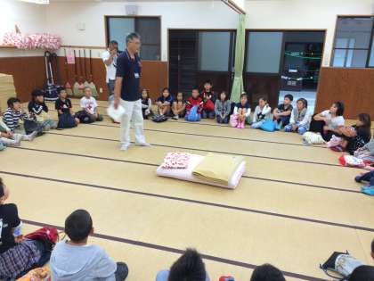 普段家で使うものと少し違います。布団は,明日バンガローで使います。