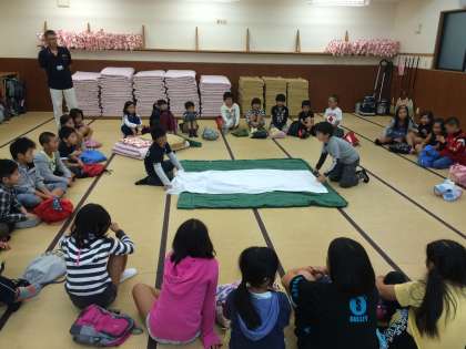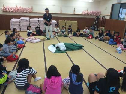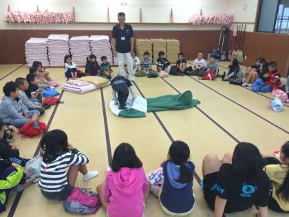 今度は,寝袋の使い方です。寝袋にもシーツをつけて使います。今日は,テントで,寝袋を使って寝ます。さて,自分たちで上手にできるかな?