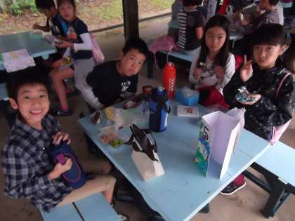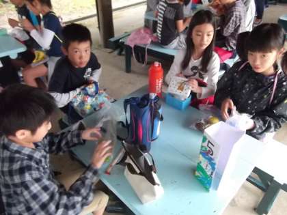 みさきの家に着いてお弁当を食べています。みんなとても元気です。
