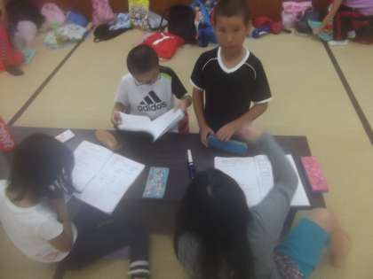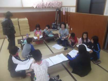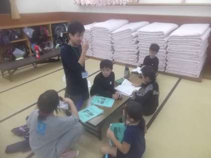 今日の全日程を無事に終了しました。全員元気です。写真は,係り活動の反省会をしています。