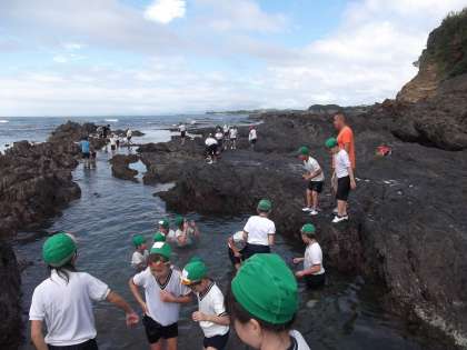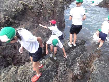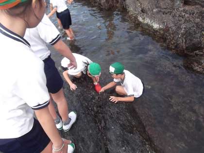 磯観察中です。いろいろな生き物を発見したみたいです。