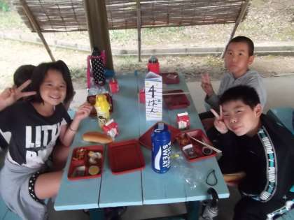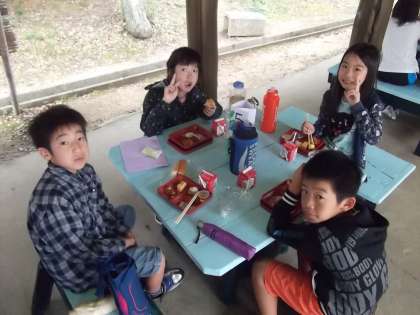 今日の朝ご飯の様子です。東屋で朝食を食べています。いただきます。