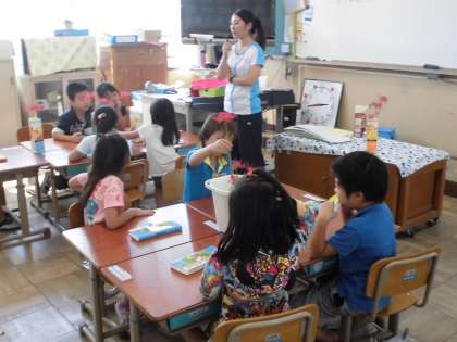 1年生は,図画工作では,秋の風物詩ひがんばなをかきました。「お花はいくつある?」と先生から聞かれると,一生懸命花の数を数えていました。「赤い花の中に黒い所あるよ。」と花の細かいとろまでよく見て,花の特徴を捉えることもできました。