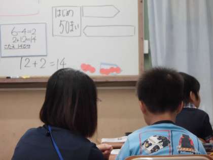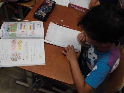 2年生の算数では,たし算とひき算の入り混じった文章問題に挑戦しました。4月のころに比べ問題文を書き写す早さもずいぶんと早くなり,子ども達が成長していることがよく分かります。