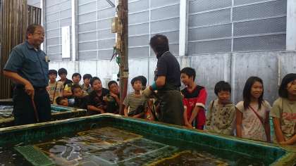 いけすの大きなあじやふぐに子ども達は大興奮です。