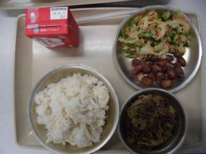 今日の給食の献立は,「麦ご飯」「牛丼の具」「アスパラの胡麻煮」「金時豆の甘煮」「牛乳」です。