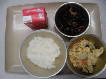 今日の給食の献立は,「ご飯」「高野どうふの卵とじ」「ひじきの煮つけ」「牛乳」です。