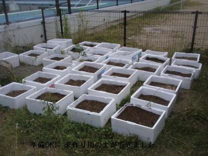 一人一バケツの「バケツ栽培」をしたかったのですが,予算がなくアルプラザで大きな発泡スチロールの箱をたくさんいただいて,その中で育てることになりました。
