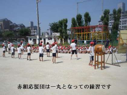 全校種目の練習の後は,応援練習でした。今まで赤,白組とも個々に練習していましたが,今日ははじめてお互いの演武を見せあいしました。
