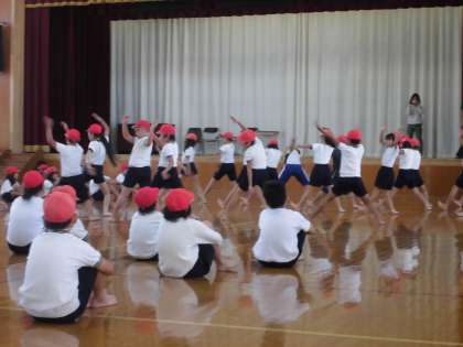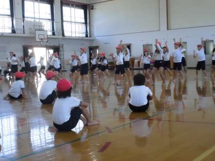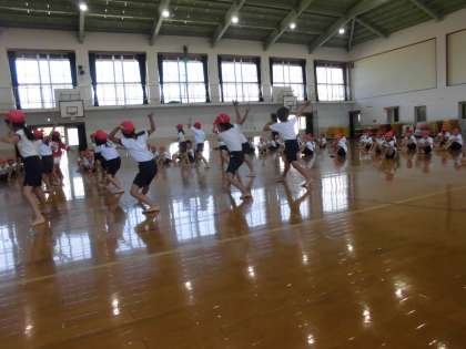 今日は,3年生と合同でソーラン節の練習をしました。体育館に子ども達の