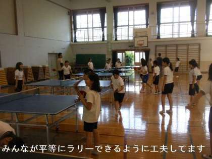 人数の多い卓球部は,卓球台6台を使っての練習です。ラリーでは,みんなが平等にできるように工夫された練習をしています。