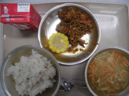 今日の給食の献立は,「麦ご飯」「スープ」「和風ドライカレーの具」「カットコーン」「牛乳」です。