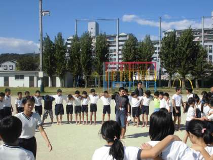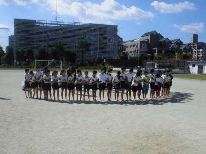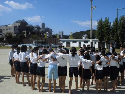 5年生と合同で組体操の練習をしています。今日は,運動場での練習でした。