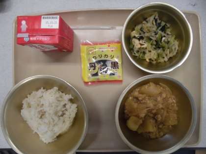 今日の給食の献立は,「麦ご飯」「じゃがいものそぼろ煮」「小松菜と切干大根のにだし」「黒大豆」「牛乳」です。