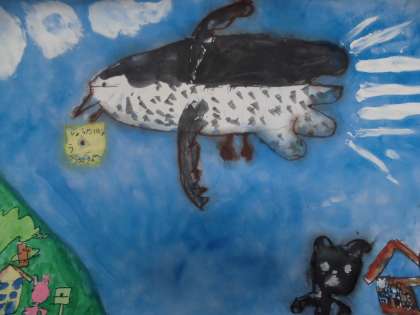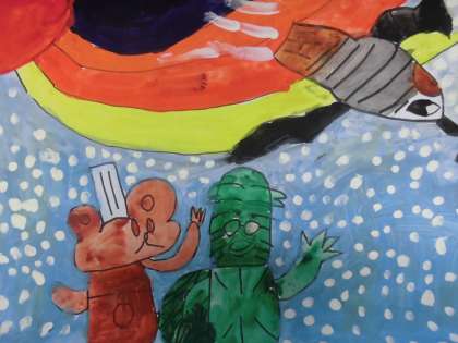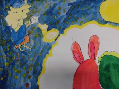 「ひつじゆうびんきょく長のひみつ」のお話を聞き,イメージをふくらませて描きました。