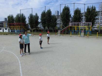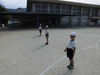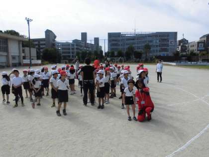 1年生と合同で団体演技の練習をしています。今日は,はじめて運動場での練習を行いました。
