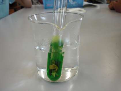 葉にでんぷんがあるかを調べるため,アルコールランプやヨウ素液などを使い実験しています。手順を確認しながら進んで実験に取り組んでいます。気分は科学者?!理科の不思議に目を輝かせています。