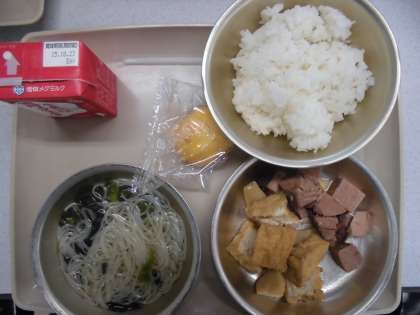 今日の給食の献立は,「胚芽米ご飯」「すまし汁」「なまぶしと厚揚げに煮付け」「かき」「牛乳」です。