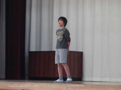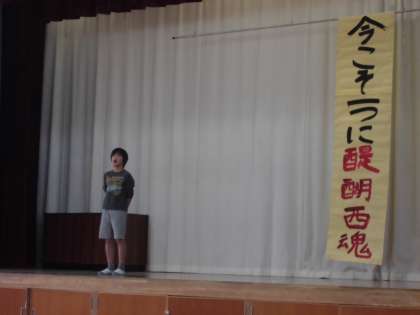 今月のダイヤ集会は,いつもよりも内容盛りだくさんです。計画委員会から,10月24日(土)に予定している運動会の大会スローガンを発表しました。今年の運動会のスローガンは「今こそ1つに醍醐西魂」。計画委員の「どこの学校にも負けない運動会にしましょう。」という言葉が印象に残りました。