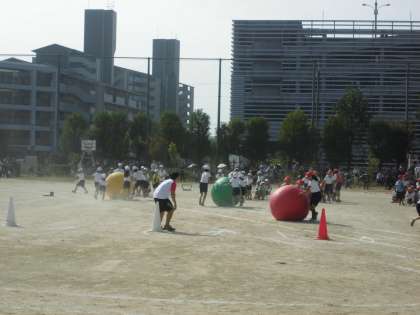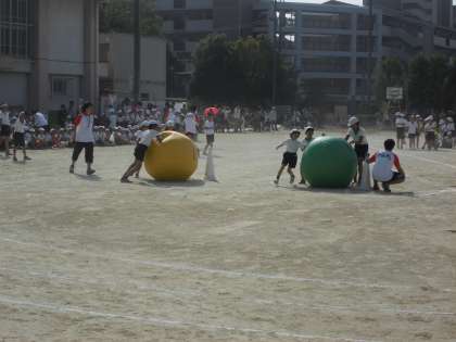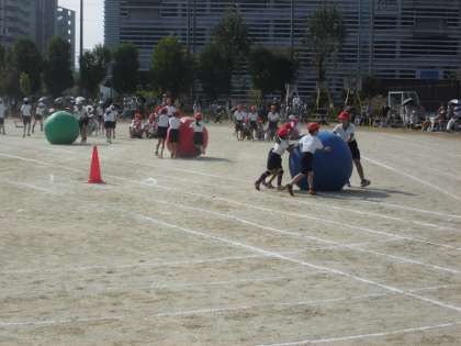 写真は,ダイヤ大玉ころがしの様子です。チームワークよく大玉を転がしていましたる