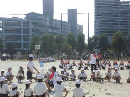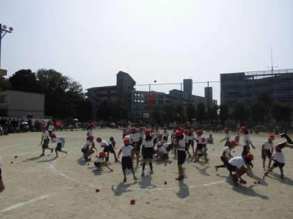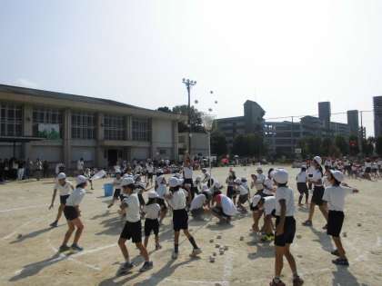 児童会種目のダイヤ玉入れです。なかなか玉がカゴに入りません。