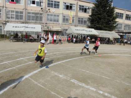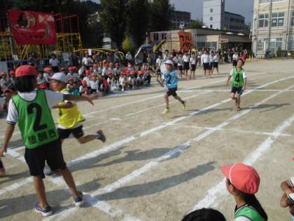 赤白対抗リレー(4〜6年生)です。高学年のリレーは,みんなとても速いです。
