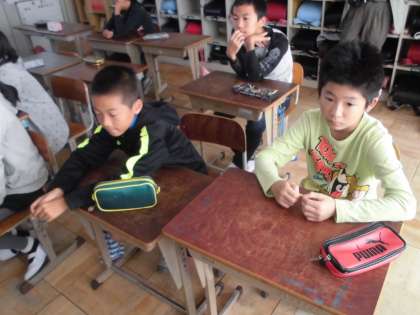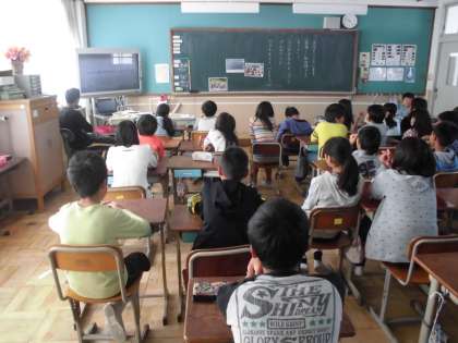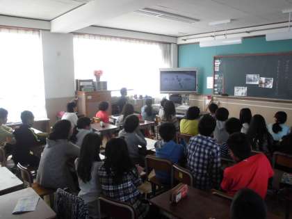 運動会で行った,ビデオを見て組体操の演技をふり返っていました。