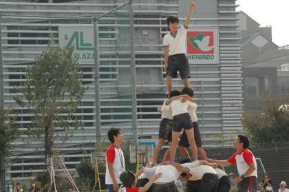本校の「組体操」では,今年度初めて5年生と6年生が合同で取り組むことになり,高さなどの派手さより,全員が友達を互いに信頼し,一つ一つの技を綺麗にきめることを中心に取り組んできました。