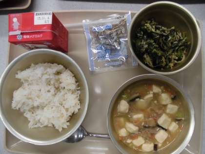 今日の給食は,麦ごはん, 豚肉と豆腐のくず煮,ホウレンソウのごま煮.牛乳,じゃこです。豚肉と豆腐のくず煮は,しっかりだしがきいて,しょうがの香りもアクセントになる¥っていて,子ども達にも大人気でした。