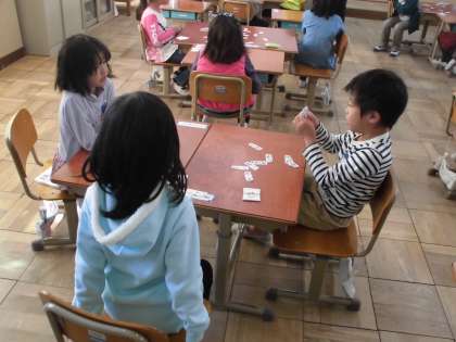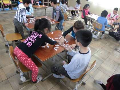 くり上がりのたし算の学習もまとめの段階です。はやく正確に計算できる力を付けるためにくり返し練習をしています。今日はたし算カードを使ってゲームをしながらの練習。「15」と言われたら,答えが15になるたし算のカードをさがしてとります。答えが15になるたし算は「9+6」「8+7」「7+8」などいくつもあるので,一つとられてもあきらめずに次をカードをとることができるのもこの練習をいいところです。是非ご家庭でもやってみてください。