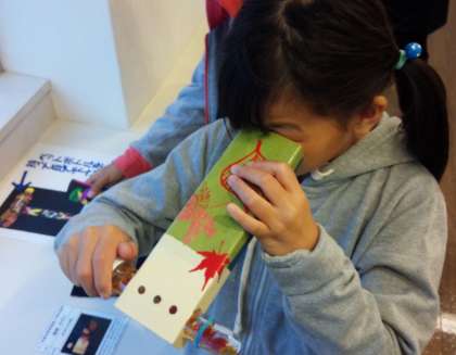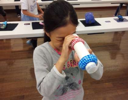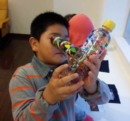 こども万華鏡コンクールの大賞作品を見ています。夢中です。