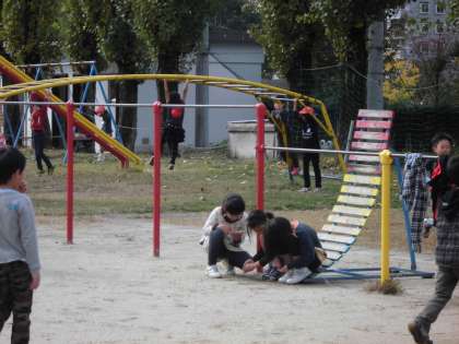 ボールで遊ぶ子、遊具で遊ぶ子、日向ぼっこしてお話しする子と