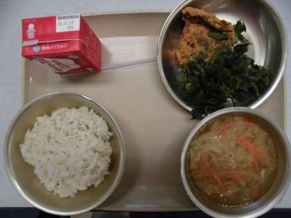 今日の給食の献立は,「麦ご飯」「キャベツの吉野汁」「ほうれん草のおかかに」「さばの竜田揚げ」「牛乳」です。