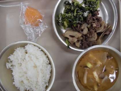 今日の給食の献立は,「胚芽米ご飯」「秋の恵のみそ汁」「大根葉とじゅこの炒め物」「牛肉と蓮根の煮付け」「かき」