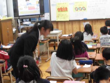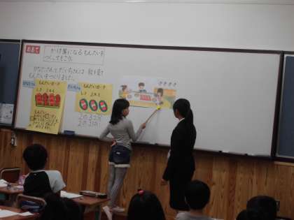 今日は,教育実習生の村上先生と一緒に算数の学習をしました。イラストをみてかけ算の問題をつくりました。「〜個の・・・つ分」になっているものに目を付けて一生懸命学習を進めていきました。最後は友だちのつくった問題をみんなで考え,かけ算になる場面を理解することができました。