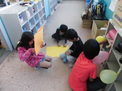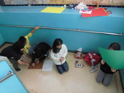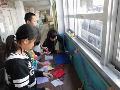 図画工作の時間に「あんなところでこんなところで」を学習しています。今日は,学校の各場所を飾り付けしていました。