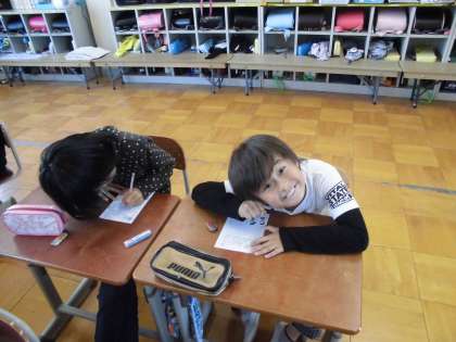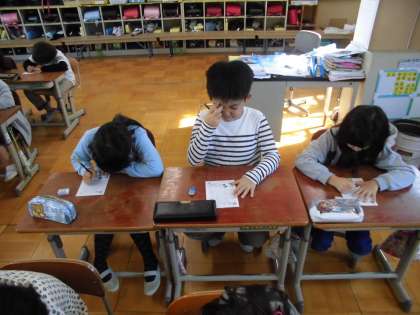 山科川駅伝に,出場する6年生に激励のメッセージカードを作っていました。