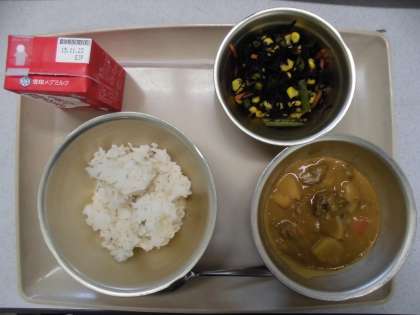 今日の給食の献立は,「麦ご飯」「カレー」「ひじきのソテー」「牛乳」です。