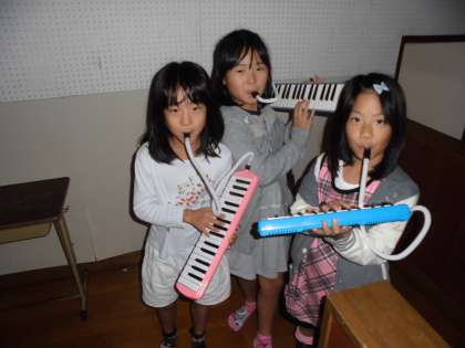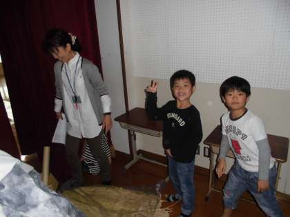 学習発表会練習を舞台で,練習しています。その舞台裏では,台詞の練習をしたり,けんばんハーモニカ(音は,鳴らしていません。)の練習をしていました。