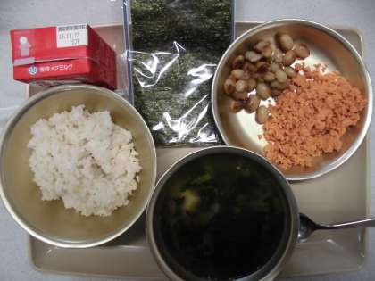 今日の給食の献立は,「麦ご飯」「豆腐の吉野汁」「とら豆の甘煮」「セルフおにぎりの具」「てまきのり」「牛乳」です。